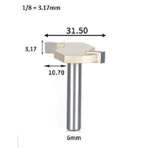 Fresa T Serrinha Debrum Serrinha T Haste 6Mm Corte 1/8 Fresa Slot / Serrinha / Serra debrum Indicada para usinagem de MDF, MDP, compensados e outros materiais madeirados para encaixe de perfis puxadores, testeiras, arremates e fundos de armários e gavetas. Haste de 6mm Corte 1/8 3,175mm