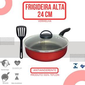 Frigideira Alta Funda 24 cm Antiaderente Teflon com Tampa de Vidro + Espátula Nylon Vermelho Frigideira 24cm com 5 camadas de Teflon Antiaderente com Tampa de Vidro + Espátula Nylon