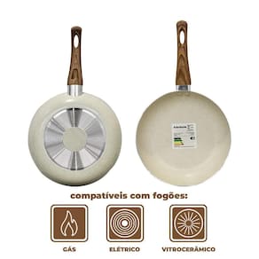 A Frigideira Sahara Vanilla possui revestimento antiaderente em cerâmica e 2,0mm espessura em sua estrutura, o que melhora o preparo de seus alimentos, pois a temperatura é dissipada de maneira uniforme e favorece o cozimento, evitando que sua comida queime facilmente. A Frigideira é produzida em alumínio na cor vanilla com revestimento cerâmico marble e classificação A do Inmetro, não gruda, é mais fácil de limpar e mais saudável, pois necessita de menos óleo para o cozimento e é livre de metais pesados. Possui cabo com acabamento siliconado Soft-Touch amadeirado, que dá um toque macio e não esquenta, trazendo um design inovador, ideal para você que gosta de sofisticação e elegância em sua cozinha. É indicada para fogões a gás, vitrocerâmico ou elétrico,