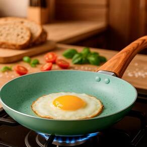 Leve praticidade, beleza e qualidade para suas receitas com a Frigideira Sahara Chama Verde 26cm da Casambiente. Com um design encantador em verde claro e cabo ergonômico em baquelite siliconado com acabamento amadeirado, ela transforma qualquer preparo em uma experiência prazerosa.