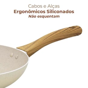 Possui cabo com acabamento siliconado Soft-Touch amadeirado, que dá um toque macio e não esquenta, trazendo um design inovador, ideal para você que gosta de sofisticação e elegância em sua cozinha.