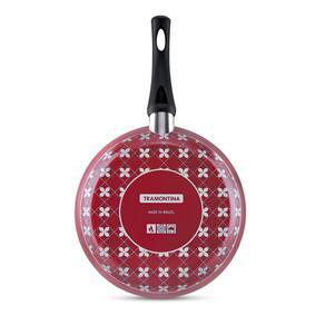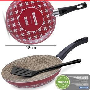 Frigideira de alumínio com revestimento interno de antiaderente Ø18cmCód. 20150718A Linha Paris é perfeita para quem gosta de preparar muitas delícias à família e receber amigos. Além de panelas com diferentes capacidades, dispõe de frigideiras, fervedores, cuscuzeiras, conjunto banho-maria, panela wok, jogos para fondue e outros. Em alumínio revestido com antiaderente Starflon T1 interno, proporcionam cozimento uniforme e são fáceis de lavar, pois os alimentos não grudam. A decoração interna das peças representa a delicadeza e dedicação de quem cozinha. E os cabos, alças e pegadores são antitérmicos permitindo o manuseio com segurança. Podem ser utilizadas em fogão a gás, elétrico e vitrocerâmico (resistência elétrica) e levadas à máquina de lavar louças. Características do produto Informações Gerais Alumínio com revestimento interno de antiaderente Starflon T1 e externo de silicone.Cabo de baquelite antitérmico.Espátula de nylon. !!!!!!!!!!!!!!!!!!Recomendações de Uso USO SEGURO E ADEQUADO:Ao utilizar utensilios quentes tenha cuidado redobrado. Se necessário, utilize proteção para as mãos e mantenha fora do alcance de crianças. Para sua segurança, ao utilizar utensílios com cabos, mantenha os mesmos sempre voltados para o centro do fogão. Ao utilizar seu utensílio em fogões com grade, mantenha a peça centralizada e alinhe o cabo com a grade, para reduzir o risco de queda.Para descarte dos produtos e embalagens siga as orientações de reciclagem vigentes. Peso0,25 kg Comprimento336 mm Largura183 mm Altura65 mm Diâmetro18.0 cm Garantia90 dias para vícios ou defeitos de fabricação
