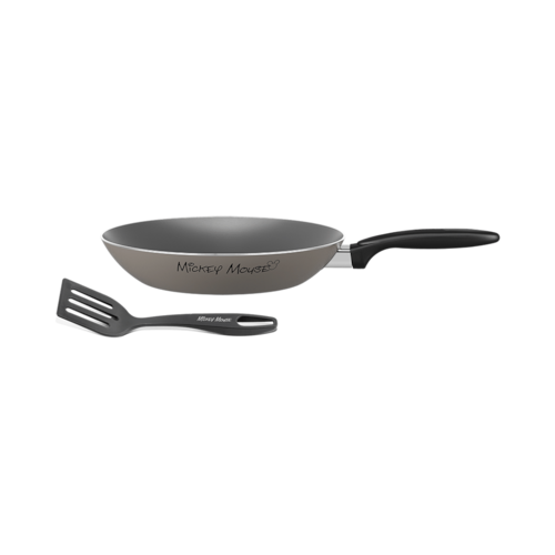 Continue a sonhar com os produtos Brinox vindos direto do mundo encantado da Disney para a sua casa!_x000D_ _x000D_ Para acompanhar as suas necessidades, a Brinox e a Disney apresentam um conjunto com duas peças: uma frigideira com Ø28cm e uma espátula perfurada, em nylon na cor prata. _x000D_ A espátula é própria para o uso na frigideira, não danifica o antiaderente e auxilia na preparação do alimento._x000D_ _x000D_ A estrutura de alumínio dissipa melhor o calor cozinhando o alimento por igual e mais rapidamente. Já o revestimento interno antiaderente evita que o alimento grude mesmo com uso reduzido de óleo. O material também facilita a limpeza. Sua segurança está garantida com o cabo de baquelite que não aquece.