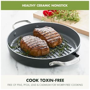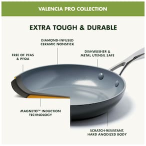 Infundido com diamantes, o revestimento antiaderente de cerâmica saudável Thermolon Minerals Pro da GreenPan é livre de PFAS, PFOA, grafite e cádmio, por isso nunca liberará gases tóxicos, mesmo se for superaquecido acidentalmente para utensílios de metal, nosso revestimento antiaderente com infusão de diamante oferece durabilidade notável, aquecimento equilibrado e limpeza sem esforço A Base de Indução Magneto do Valencia Pro traz incrível queima e escurecimento para todos os fogões, incluindo indução, além do corpo de alumínio anodizado duro é incrivelmente durável e resistente a arranhões A alça de aço inoxidável polido espelhado permanece fria graças a um recorte em forma de V Adequado para todos os fogões, incluindo indução Marca: Não Informado
