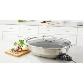 A frigideira elétrica Cuisinart® de aço inoxidável escovado é um dos aparelhos de cozinha de bancada mais versáteis do mercado e uma adição valiosa a qualquer cozinha. Uma sonda de temperatura se ajusta de quente para 450° F e pode ser removida para tornar a frigideira lavável na máquina de lavar louça. A superfície de cozimento antiaderente é ideal para cozinhar com baixo teor de gordura ou sem gordura e é grande o suficiente para pedidos familiares de panquecas ou uma fajita com amigos.
