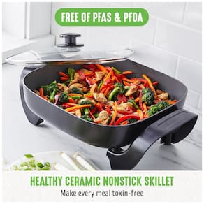 Se você procura por uma cozinha completa que pode ser apenas conectada, não procure mais. Com a Frigideira Elétrica 5 em 1 GreenLife, você pode fritar, refogar, assar, grelhar, cozinhar no vapor e muito mais. Nosso revestimento antiaderente cerâmico saudável foi especialmente projetado para aparelhos de cozinha, proporcionando um desempenho antiaderente ideal. Além disso, nosso revestimento é livre de PFAS, PFOA, grafite e cádmio, permitindo que você cozinhe de forma mais saudável. Com capacidade de 4,7 Litros e área de superfície de 30,48 x 30,48 cm, você tem espaço suficiente para porções grandes que toda a família pode desfrutar, desde grandes lotes de panquecas e ovos de manhã até deliciosas lasanhas e filés de frango à noite. O controle de um botão permite ajustar a temperatura desejada para resultados perfeitos, enquanto os cabos frios ao toque e a base antiderrapante mantêm você confortável e no controle. Além disso, a tampa de vidro temperado mantém o calor, a umidade e o sabor enquanto você acompanha o progresso das refeições. Basta limpar a frigideira quando terminar ou colocá-la na lava-louças para sujeiras difíceis. Não perca a chance de ter uma cozinha saudável e funcional com a GreenLife!