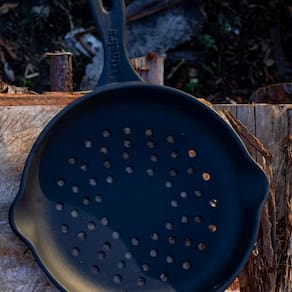A Frigideira Vazada Grill Estilo Cabo e Alça de Ferro da Panela Mineira oferece um design moderno e autêntico, com fundo reto perfurado e lados baixos e inclinados para facilitar o manuseio e escoamento de líquidos. Sua excepcional distribuição e retenção de calor, típicas do ferro fundido, a tornam perfeita para grelhar. Um produto completo, prático e resistente, indicado para carnes, legumes e outros.