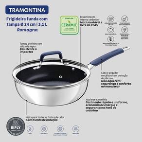 A frigideira funda com tampa Tramontina Romagna em aço inox e alumínio com revestimento interno cerâmico Black Stone de 24 centímetros de diâmetro e 3,1 litros de capacidade é a escolha certa para quem deseja unir estilo e funcionalidade. A Tecnologia Biply Induction, que une aço nox e alumínio e com revestimento interno cerâmico, torna o cozimento rápido e uniforme além da economia de energia e segurança na hora de cozinhar. A frigideira é com todos os tipos de fogões, inclusive de indução. Possui cabos metálicos com proteção de silicone, oferecendo maior conforto durante o manuseio. Mais qualidade e praticidade na sua cozinha com as frigideiras Tramontina.