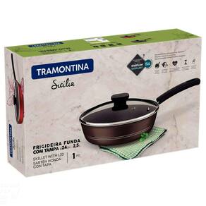A frigideira funda Tramontina com tampa Sicília em alumínio com revestimento interno e externo em antiaderente Starflon Excellent avelã 24 centímetros de diâmetro 2,5 litros é a escolha ideal para fazer frituras de imersão, como batatas fritas para acompanhar aquele bife delicioso. Desenvolvida com corpo em alumínio com revestimento antiaderente Starflon Excellent, ela propociona o cozimento dos alimentos de maneira rápida e uniforme, além de evitar que eles grudem em sua superfície. Seu cabo é em baquelite antitérmico e proporciona um manuseio muito mais confortável e seguro, pois não aquece. Ela ainda é muito fácil de limpar e pode ser levada à máquina de louças, otimizando suas tarefas na cozinha. Uma frigideira de alta qualidade, durável e não prejudicial a saúde, perfeita para completar sua cozinha! Orientações Corpo de alumínio com espessura de 3,0 mm que proporciona cozimento rápido e uniforme. Revestimento interno e externo de antiaderente Starflon Excellent que não gruda, é fácil de limpar, mais durável, não é prejudicial a saúde e é livre de PFOA.Tampa de vidro temperado, com saída de vapor e borda de aço inox. Cabo e pegador de baquelite antitérmico que oferecem segurança durante o manuseio. Pode ir à máquina de lavar louças facilitando seu dia a dia. Características Gerais EAN13 7891112299849 DUN14 17891112299846 NCM 7615.10.00 Peso Líquido 1,4300 kg. Peso Bruto 1,7000 kg. Metragem 0,011513 m³. Dimensões Embalagem (Compr. X Larg. X Alt.) 430x 105x 255 mm. Dimensões Produto (Compr. X Larg. X Alt.) 440x 254x 102 mm. Diâmetro 24,0 cm. Capacidade 2,50 l. Espessura 3,0 mm. Cor 1 83786F Hexa Observações A capacidade volumétrica máxima para cozimento é de 3/4 da capacidade total da peça. Posicione o cabo do utensílio voltado ao centro do fogão. Em fogões com grade, centralize a peça e alinhe o cabo com a grade. Utensílios quentes devem estar fora do alcance das crianças. Este produto não pode sofrer modificações. Antes do primeiro uso, lave com esponja macia, sabão neutro ou detergente líquido. Depois de secar, unte a área interna com óleo ou gordura e leve ao fogo por um ou dois minutos. Deixe esfriar e lave novamente. Seu utensílio Starflon está pronto para uso com ou sem gordura, sempre em fogo baixo ou médio (nunca superior a 260ºC). Para mexer os alimentos use somente utensílios de silicone, nylon ou madeira.Limpeza: Evite a imersão do utensílio quente em água fria.Nunca utilize produtos abrasivos na lavagem. Se deixar queimar alimentos, umedeça a área e reserve até que possa remover os resíduos grudados com esponja e sabão. Para descarte do produto e embalagem siga as orientações de reciclagem vigentes. Este produto não necessita de manutenção, apenas limpeza.