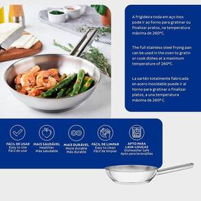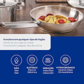 Frigideira Fundo Triplo Tramontina Brava 62415240 Inox Frigideira Fundo Triplo Tramontina Brava 62415240 Inox - Características Gerais do Produto: Dimensões AxLxP (mm): 80x251x427 Material: Aço Inox Tecnologia da Panela: Fundo Triplo Linha: Brava Capacidade da Panela: 2,1L Pode ir ao forno?: Sim, para gratinar ou finalizar pratos na temperatura máxima de 260C. Pode ir à Máquina de Lavar Louças?: Sim Tampa: Não Tipo de Fogão: Gás, elétrico, vitrocerâmico e indução
