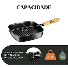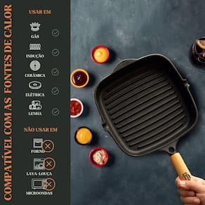 Frigideira Grill Quadrada fabricada em ferro fundido, indicada para o preparo de carnes, legumes, peixes e grelhados em geral, proporcionando marcas de grelha bem definidas, cozimento uniforme e excelente retenção de calor. O ferro fundido garante estabilidade térmica e conservação do sabor, enquanto o cabo em madeira naval oferece segurança no manuseio e agrega charme ao servir.