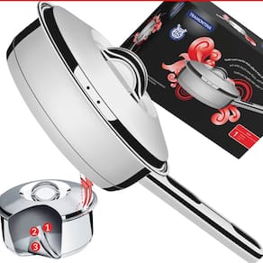 O design moderno e diferenciado, aliado ao acabamento em alto brilho, confere um toque de sofisticação à sua cozinha. A frigideira também vem equipada com uma tampa com saída de vapor e encaixe perfeito, garantindo praticidade e eficiência no preparo das suas refeições.