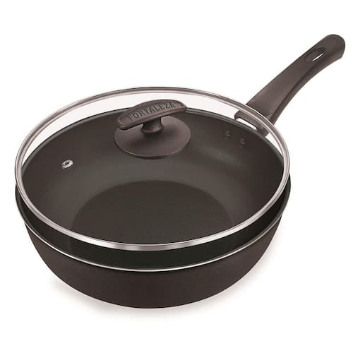 Frigideira Nº30 Com Tampa De Vidro Black Fortaleza Frigideira tradicional da culinária chinesa, ideal para fazer Yakisoba, Chow Mein, entre outros pratos tradicionais desta culinária exótica e saborosa, além claro de fazer pratos bem brasileiros como risotos, fritadas entre outros. Produto fabricado no melhor padrão de qualidade, com alumínio 100% puro e aplicação de antiaderente de qualidade máxima, os alimentos não grudam em sua superfície, o que ajuda a evitar o uso exagerado de gordura no preparo dos alimentos, tornando-os mais saudáveis. O fundo usinado dos produtos, além de fazer com que não escorregue no fogão, permite que o calor se distribua melhor e desta forma, fritando, grelhando, assando ou cozendo de forma homogênea. Produtos de alta qualidade, fabricado com materiais de qualidade, é muito fácil de usar, prático, fácil de limpar e muito resistente. Código 776670 Descrição Frigideira Alta com Tampa de Vidro 30 Capacidade/medidas 4,2 Litros Registro INMETRO 004714/2018004714/2018 Certificado Produto com certificação compulsória - Segurança OCP-0041. Classe de desempenho Aderência - A - ÓTIMO . Número de Registro 004714/2018 120 dias para defeitos de fabricação Indicado para: Fogão - A gás / Elétrico