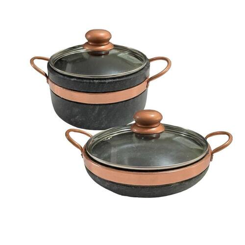 KIT PANELA + FRIGIDEIRA DE PEDRA SABÃO TAMPAS DE VIDRO COM PEGADOR EXCLUSIVO