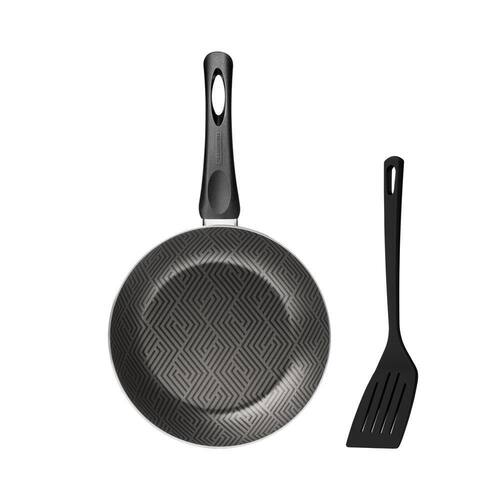 Corpo de alumínio com espessura de 1,8 mm que proporciona cozimento rápido e uniforme. Revestimento interno e externo de antiaderente Starflon Max que não gruda, é fácil de limpar, mais durável e não é prejudicial à saúde, pois é livre de PFOA. Cabo de baquelite antitérmico que oferece segurança durante o manuseio. Espátula de Nylon que permite uso em temperaturas de até 180 C e cabo com furo passante possibilitando que seja pendurado na sua cozinha. Podem ir à máquina de lavar louças facilitando seu dia a dia.