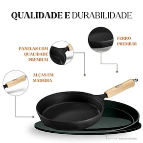 A Frigideira Tradição Cabo de Madeira da Panela Mineira® é um produto moderno, prático e eficiente, que apresenta alto desempenho no preparo de diversas receitas. O calor distribuído por toda a superfície faz com que o alimento cozinhe de maneira uniforme, conservando suas propriedades e nutrientes. Possui um design autêntico e elegante, com fundo reto e bordas alongadas, o que a torna excelente para grelhar, fritar, cozinhar e servir. Muito utilizada em bares e restaurantes pela sua apresentação e por manter-se quente por muito mais tempo.