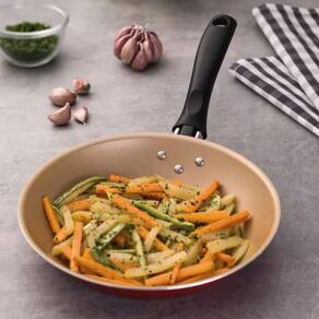 Para levar aquele toque de charme para sua cozinha, a frigideira Tramontina Turim em alumínio com revestimento interno e externo em antiaderente Starflon Max vermelha 18 centímetros de diâmetro 0,7 litros é indispensável. É produzida em alumínio com espessura de 1,2 milímetros e ela possui revestimento interno e externo em antiaderente Starflon Max, que evita que os alimentos grudem em sua superfície, a torna fácil de limpar, mais durável e não prejudicial a saúde. O cabo proporciona um manuseio muito mais seguro e confortável, pois é produzido em baquelite antitérmico, material que não aquece. Ela ainda é muito prática e pode ir à máquina de lavar louças, facilitando o seu dia. Escolha Tramontina e leve o melhor para sua cozinha!