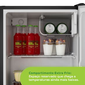 Seu interior conta com prateleira removível, porta garrafas flexível e porta-latas, oferecendo organização e segurança para armazenar desde pequenos alimentos até garrafas grandes. O compartimento extra frio é ideal para bebidas que precisam estar trincando.