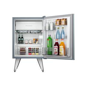 Frigobar Brastemp Retrô 76 litros com design vintage, pés palito, puxadores metálicos e logo Brastemp dos anos 50. Possui compartimentos modulares, cesto cromado e freezer.