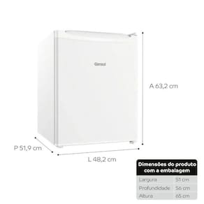Características: Capacidade útil: 76 litros -refrigerador: 68 litros e freezer: 8 litros- Controle de temperatura Interno Porta latas: Sim Classificação Energética: A Consumo de energia: 17,5 kWh/mês