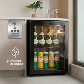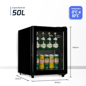 Frigobar expositor vertical com 50 litros de capacidade, gás ecológico R600a, prateleiras ajustáveis e porta de vidro. Controle de temperatura com termostato ajustável. Luz interna e bandeja de água inclusas. Condensador interno.Características