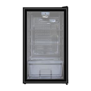 Frigobar expositor vertical com porta de vidro, capacidade de 95 litros, controle de temperatura mecânico, prateleiras de vidro ajustáveis e gás ecológico R600a.Características