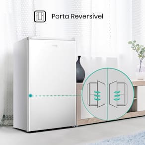 Frigobar Hisense 115 Litros com porta reversível, ideal para pequenos espaços. Possui termostato e pés ajustáveis.Características