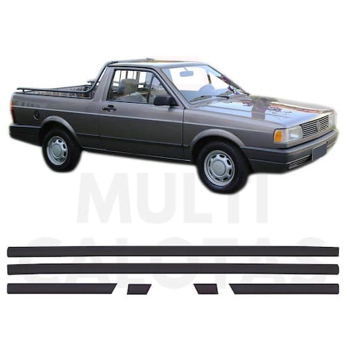 Kit Friso Lateral para o Volkswagen Saveiro CL 1989 a 1995. Contém: - Dois 2 Frisos Grandes para as portas - Dois 2 Frisos Medios que vão a tras da porta - Dois 2 Frisos Pequenos que vão a frente da porta Referência: 540A Cor: Cinza Fosco Material: Borracha Injetada Comprimento: 117 cm grande / 38 cm medio / 8 cm pequeno Largura: 4 cm todos Espessura: 1,5 cm todos Aplicação: Autocolante incluido fita dupla face Marca: Top Mix