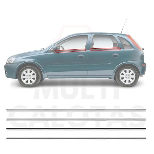 Kit Friso Pestana para o Chevrolet Corsa Contém: - Quatro 4 Frisos, um para cada porta Referência: 240A Cor: Cromado Material: Alumínio Comprimento: 80 cm todos Largura: 2 cm todos Espessura: 0,5 cm todos Aplicação: Encaixe Marca: Top Mix