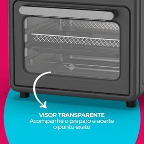 Fritadeira e forno 2 em 1 com design retrô, capacidade de 9L, visor transparente, acessórios inclusos (prateleira e grelha ajustáveis) e 1500W de potência.Porta-fio