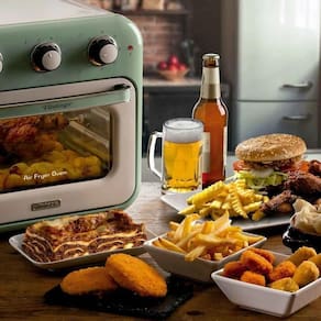 A Air Fryer Oven Vintage Ariete combina alta capacidade, tecnologia moderna e o charme retrô da linha Vintage! Com 16 litros de capacidade, ela permite preparar grandes porções com apenas uma colher de sopa de óleo, garantindo pratos crocantes, leves e cheios de sabor. O sistema de circulação de ar quente ajustável de 80C a 230C distribui o calor de forma uniforme, criando uma crosta dourada e saborosa, sem precisar de fritura tradicional. Acompanha 3 cestos de aço inox perfurados, cesto giratório e espeto para frango, perfeitos para preparar diferentes alimentos ao mesmo tempo. Os controles frontais facilitam o ajuste de tempo, temperatura e programas, enquanto o design retrô traz um toque de elegância para a sua cozinha. Além de prática e fácil de limpar, a Air Fryer Oven Vintage ainda tem baixo impacto ambiental, sem gerar resíduos de óleo.