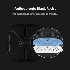 O modelo conta com revestimento antiaderente Black Resist, que possui três camadas de proteção, evitando que os alimentos grudem e facilitando a limpeza. Além disso, a grelha removível pode ser lavada na lava-louças, o que torna o dia a dia ainda mais prático.