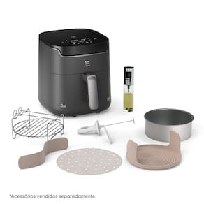 A Air Fryer Electrolux por Rita Lobo 5,6L Cinza Experience possui painel digital Assistant Touch, super-intuitivo e de fácil operação. Ele conta com 5 receitas sugeridas: batata, vegetais, frango, carne e peixe e 4 funções: Função Virar, aviso sonoro e luminoso que indica a hora de virar o alimento; Função AirFry, ideal para fritar ou assar sem uso de óleo; Função Assar, para fazer bolos, muffins e outras receitas incríveis de forma rápida e fácil; e Função Reaquecer, que reaquece sua refeição sem perder o sabor. Sem desperdício, você promete que os pratos do dia anterior continuem saborosos como se fossem feitos na hora.