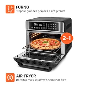 O design moderno com acabamento em inox da fritadeira OVEN inclui um visor amplo com iluminação interna, facilitando o monitoramento dos pratos. Sua alta potência e a tecnologia de circulação de ar quente proporcionam rapidez e eficiência. E o termostato inteligente reduz o consumo de energia.