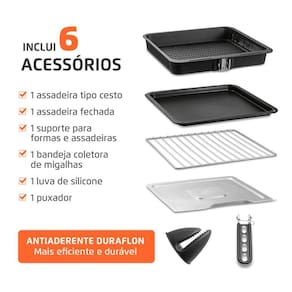 01 Fritadeira; 02 Assadeiras; 01 Coletor de Migalhas; 01 Suporte de Formas; 01 Luva de Silicone 01 Livro de Receitas; 01 Manual de Instruções.