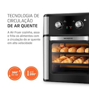 2 EM 1 - AIR FRYER + FORNO: A família de Air Fryers Mondial continua crescendo! O modelo OVEN une as vantagens da tecnologia da Air Fryer ao espaço e versatilidade do forno. Você pode assar, cozinhar e fritar sem óleo e com perfeição.