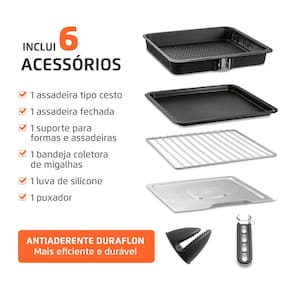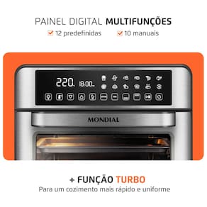Fritadeira Air Fryer Forno Oven Digital Mondial AFO-25L-BI 25L com potência de 2000W (127V) ou 2200W (220V), painel digital, temperatura máxima de 220°C, timer de 90 minutos, revestimento antiaderente, luz interna e acabamento em inox.Porta-fio