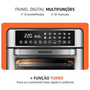 Fritadeira Air Fryer Forno Oven Digital Mondial AFO-25L-BI 25L com potência de 2000W (127V) ou 2200W (220V), painel digital, temperatura máxima de 220°C, timer de 90 minutos, revestimento antiaderente, luz interna e acabamento em inox.Porta-fio