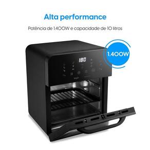 Fritadeira Air Fryer Forno Style Oven Fry 10 Litros 220v 1.400w Grelha Removível Com Painel Digital. Design compacto com 10 litros de capacidade interna. Potência de 1.400W. Painel touchscreen digital com 10 funções pré-programadas. Funcionalidade 3 em 1: assa, frita e reaquece. Tecnologia Air Circuit 360 para cozimento uniforme. Luz interna e porta com visor transparente. Revestimento antiaderente Black Resist de tripla camada. Função esterilizar (70C por 18 minutos). Acessórios: grelha antiaderente e bandeja coletora. Controle de temperatura ajustável de 80C a 200C. Proteção contra superaquecimento.Porta-fio