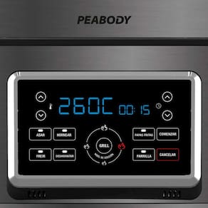 Fritadeira Air Fryer Grill Peabody com capacidade de 6 litros, corpo em aço inoxidável, cozimento por convecção forçada, 7 programas predefinidos (Grelhar, Assar, Desidratar, Air Fry, Grill, Fritas e Carne), painel Touch com display LED, temperatura ajustável de 40°C a 265°C e alarme sonoro.Porta-fio