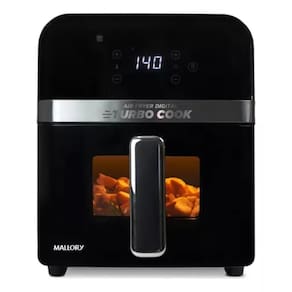 Fritadeira Air Fryer Mallory Turbocook com visor em vidro, capacidade de 6 litros, controle de temperatura ajustável e timer. Permite acompanhar o preparo dos alimentos sem abrir o cesto.Porta-fio