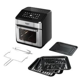 Rotisserie + acessórios: Espeto rotativo para fazer carnes e frangos + 3x grelhas com revestimento antiaderente e uma bandeja coletora, com profundidade adequada para acomodar melhor os alimentos.