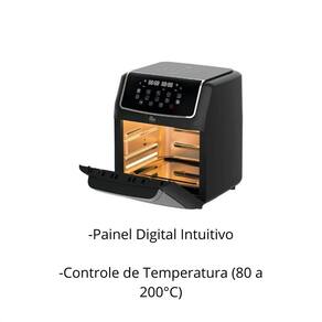 Fritadeira Air Fryer Oven multifuncional com capacidade de 12 litros e potência de 1900W. Permite assar, gratinar, grelhar e fritar com até 80% menos gordura. Possui design moderno com visor transparente e programas pré-definidos.Porta-fio