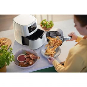 Fritadeira Airfryer Digital Philips Walita Série 3000 4,1 Litros 1400w Branco Ri9252/01 - 127v Fritadeira Airfryer Digital Philips Walita Série 3000 4,1 Litros 1400W Branco RI9252/01 - 127V A única com Tecnologia RapidAir patenteada que garante o fluxo de ar por todos os lados, o cozimento mais rápido e uniforme, deixando os alimentos macios por dentro e crocantes por fora. São 1400W e capacidade total de 4,1L e útil de 0,8kg. Com ajuste de temperatura de 80 a 200 graus, timer de 60 minutos e desligamento automático. Display Digital. Fácil de lavar: peças removíveis e preparadas para a máquina de lavar. Inspire-se com + de 200 receitas no App NutriU.