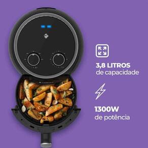 Fritadeira sem óleo com 1300W de potência, capacidade de 3,8L, timer de 60 minutos e seletor de temperatura de 80 a 200°C.Porta-fio