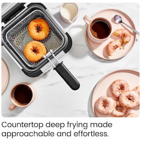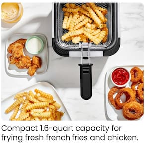 Design compacto, capacidade de 1,5 litros, aquecedor de 1000 watts, temperatura de até 190°C, janela transparente, cesto estilo restaurante, luz indicadora de energia, acabamento em aço inoxidável, tampa removível com filtro embutido, peças laváveis na lava-louças, cabo magnético destacável, certificada pela UL, tecnologia de segurança avançada.Porta-fio