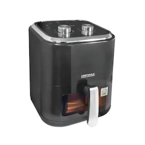 Fritadeira elétrica sem óleo com capacidade de 5 litros, potência de 1350W, temperatura ajustável de 80°C a 200°C, timer de até 60 minutos, visor com iluminação LED, cesto removível com revestimento antiaderente e gaveta com trava de segurança.Porta-fio