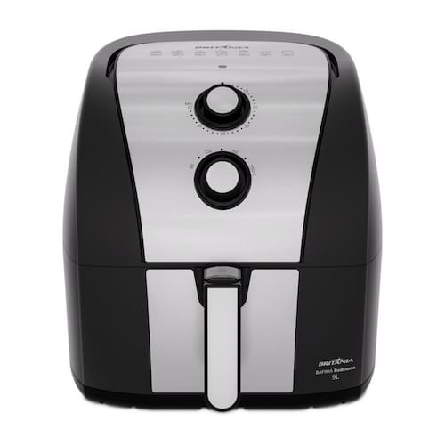 Fritadeira Elétrica Air Fryer Britânia com cesto de 9L, revestimento antiaderente Redstone, tecnologia Air Flow 360°, seletor de temperatura ajustável (80°C a 200°C), timer de 60 minutos e desligamento automático.Porta-fio