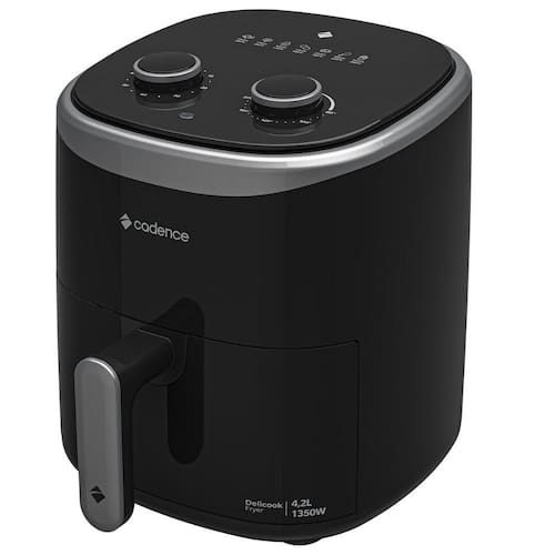 Fritadeira Elétrica Air Fryer Cadence FRT420 com capacidade de 4,2 litros, timer de 60 minutos, seletor de temperatura ajustável de 80°C a 200°C e grelha Easy Clean removível.Porta-fio