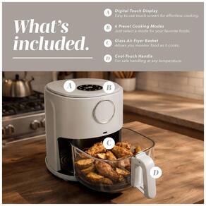 A fritadeira elétrica COOK WITH COLOR YWAF52 é uma air fryer compacta com capacidade aproximada de 3,8 litros, adequada para porções de até 3 a 4 pessoas. O sistema de aquecimento de 1200W trabalha com circulação de ar quente em alta velocidade, proporcionando preparo rápido de alimentos com menor uso de óleo. A faixa de temperatura ajustável de cerca de 80 °C a 204 °C permite configurar diferentes níveis de calor para snacks, carnes, legumes e outros pratos. ? A cesta de fritura em vidro possibilita visualização total do alimento durante o preparo e favorece distribuição uniforme de calor. O material em vidro é compatível com lava-louças, facilitando a limpeza após o uso. O painel digital com comandos por toque integra 6 programas pré-configurados que ajustam automaticamente tempo e temperatura para diferentes tipos de receitas. ? O temporizador de até 60 minutos permite controle preciso da duração do ciclo de cocção, reduzindo o risco de superaquecimento dos alimentos. A estrutura externa em aço inoxidável com acabamento em tom bege foi projetada para uso em bancada, combinando design decorativo com dimensões adequadas para cozinhas com espaço limitado. A fritadeira é indicada para preparo doméstico de alimentos por circulação de ar quente, respeitando os parâmetros de tempo e temperatura especificados no manual.